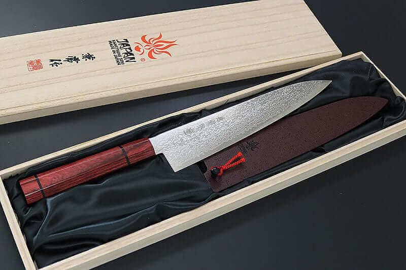 Proudly made in Seki city, Japan, this knife comes in a deluxe wooden box and has the option to come with a traditional Japanese "Aka-Ishime" finished blade saya.
